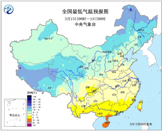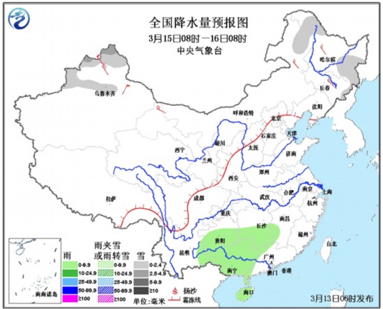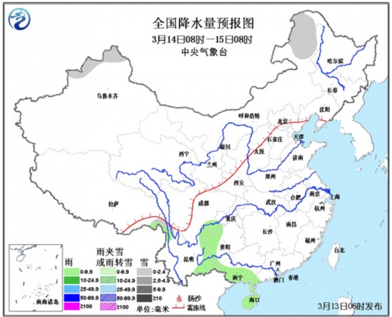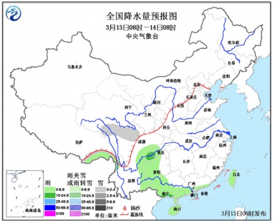 3月13日08时至14日08时,青藏高原东部小雪或雨夹雪;西南地区东部、华南南部等地有小到中雨。黄海南部海域、东海大部海域将有7~8级、阵风9级的西北到偏北风,台湾海峡、台湾以东洋面将有7~8级、阵风9级的东北风。