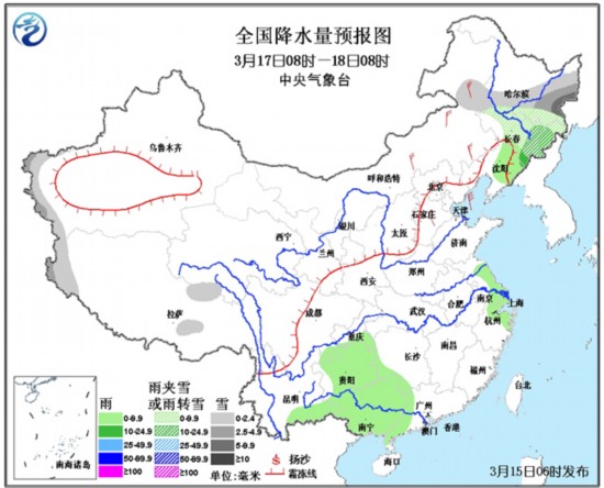 17日08时至18日08时,新疆西部、西藏西部、东北地区中部和东部等地有小到中雪或雨夹雪,其中黑龙江东部局地有大雪;云南东南部、贵州大部、广西、广东西部、江苏东部、浙江东北部等地有小雨。内蒙古中东部等地有4~5级风。