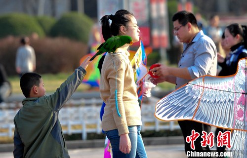 3月16日,济南街头,一名女孩肩扛鹦鹉逛街,吸引了许多民众的注意。中新社发 张勇 摄