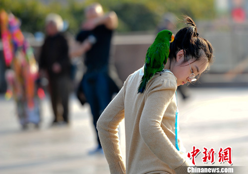 济南女孩“肩扛”鹦鹉逛街 引人侧目(图)
