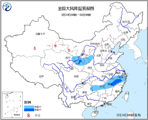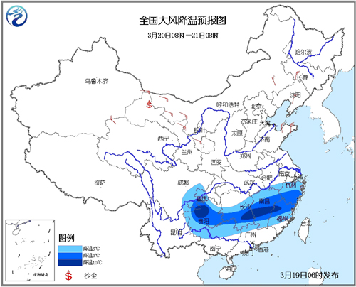 中国气象网讯 19~20日,受较强冷空气影响,西北地区和中东部地区将出现一次较大范围大风降温天气过程。内蒙古西部、甘肃西部、和新疆东部有5~6级偏东风,中东大部地区有4~6级偏北风;甘肃河西、内蒙古中西部、宁夏北部等地的部分地区将出现沙尘天气;西北地区东部和南方大部地区气温将下降4~8℃,局部地区降温幅度可达10℃。南方地区有一次明显的降水过程,西南地区东部和江南等地有中到大雨,部分地区并伴有雷电,局地有暴雨及强对流天气。