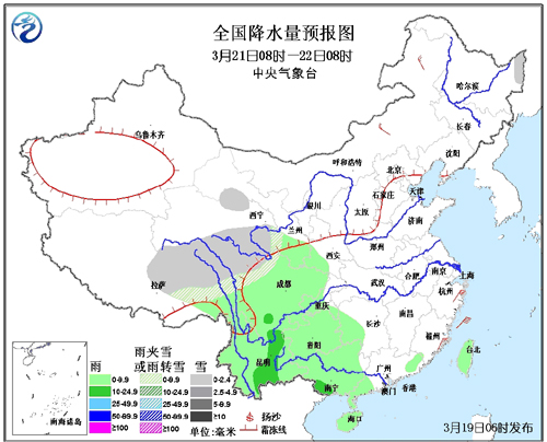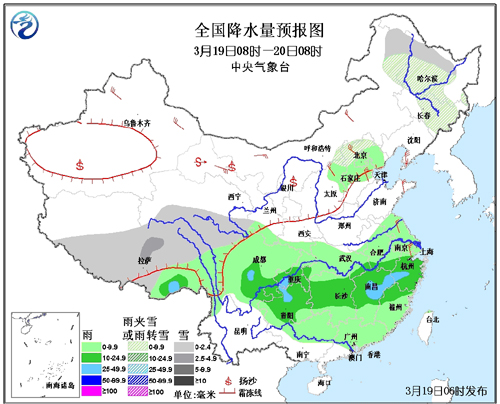 3月19日08时至20日08时,西藏西南部和东北部、青海南部、内蒙古东北部、东北中东部、华北北部等地有小到中雪或雨夹雪;华北中部以及南方大部地区有小到中雨,其中,四川盆地南部、贵州北部、江西中部、浙江西部等地的局部地区有大雨。新疆北部、甘肃西部、内蒙古中西部、华北大部、黄淮东部、江淮东部有4~6级风。甘肃西部、内蒙古西部、南疆盆地等地的局部地区有扬沙或沙尘暴等沙尘天气。