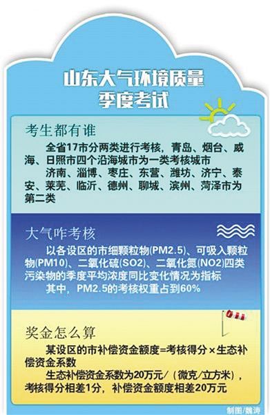 按照“将生态环境质量逐年改善作为区域发展的约束性要求”和“谁保护、谁受益;谁污染、谁付费”的原则,山东将以各设区市细颗粒物(PM2.5)、可吸入颗粒物(PM10)、二氧化硫(SO2)、二氧化氮(NO2)季度平均浓度同比变化情况作为考核指标,建立考核奖惩和生态补偿机制,PM2.5、PM10、SO2、NO24类污染物考核权重分别为60%、15%、15%、10%。