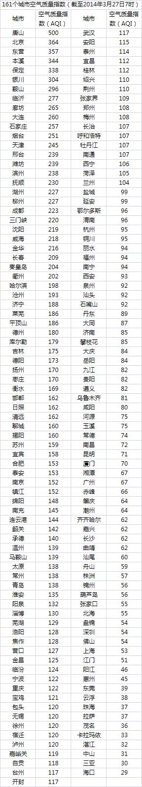 说明:自2014年1月1日起,环保部发布空气质量实时信息、空气质量月报及参与空气质量排名的地级城市已由74个增加到161个,包含了直辖市、省会城市、计划单列市、“三区”所有地级城市、环保重点城市和环保模范城市。人民网环保频道将采用环保部的官方数据,对161个城市每日空气质量进行排行。(实习生 朱宁君)