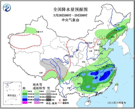 人民网北京3月28日电 (杨翼)昨日,我国中东部地区出现大范围降雨,四川盆地南部及江南中部地区雨势较大,江西中北部局地降暴雨。预计今天起至4月1日,雨势将继续加大,湖南、江西、福建、浙江、华南中北部等地的部分地区将出现较大范围的大到暴雨天气。