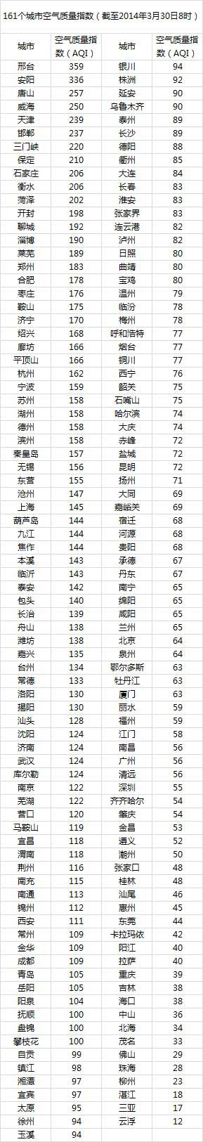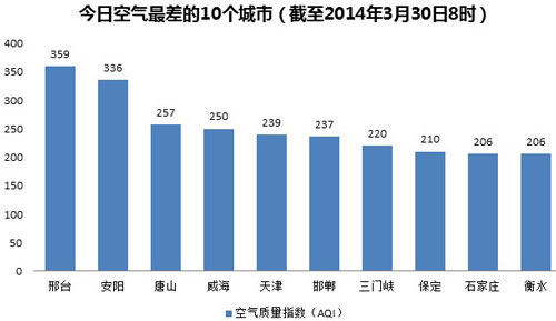 人民网北京3月30日电 (杨翼)根据环保部公布的最新数据,截至今天早上8时,邢台的AQI(空气质量指数)为359,属于严重污染,成为161个参与空气质量排名的城市中空气质量最差的城市。今日空气质量最差的10个城市分别是邢台、安阳、唐山、威海、天津、邯郸、三门峡、保定、石家庄和衡水。其中邢台、唐山、邯郸、保定、石家庄和衡水等6个城市属于河北省。