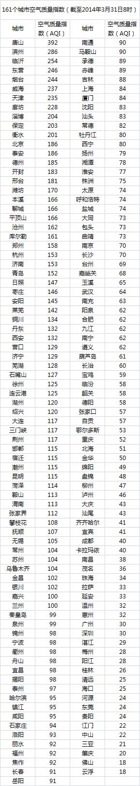 说明:自2014年1月1日起,环保部发布空气质量实时信息、空气质量月报及参与空气质量排名的地级城市已由74个增加到161个,包含了直辖市、省会城市、计划单列市、“三区”所有地级城市、环保重点城市和环保模范城市。人民网环保频道将采用环保部的官方数据,对161个城市每日空气质量进行排行。