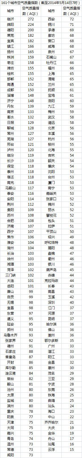 说明:自2014年1月1日起,环保部发布空气质量实时信息、空气质量月报及参与空气质量排名的地级城市已由74个增加到161个,包含了直辖市、省会城市、计划单列市、“三区”所有地级城市、环保重点城市和环保模范城市。人民网环保频道将采用环保部的官方数据,对161个城市每日空气质量进行排行。
