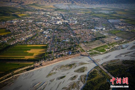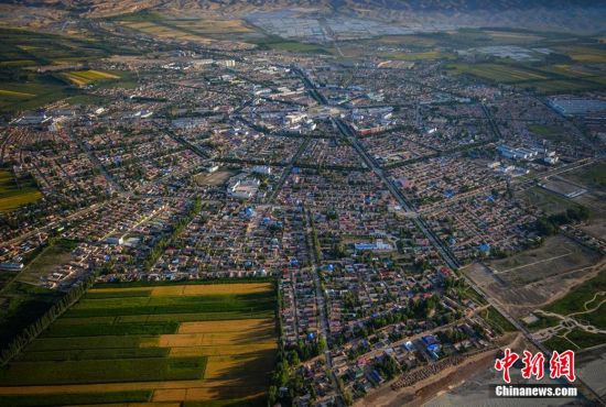 8月3日,记者乘坐动力三角翼从新疆特克斯县周边的山顶起飞,从空中俯拍世界最大规模的八卦城。来自全国各地的飞行爱好者们正在此地参加由特克斯县天翼航空俱乐部组织的飞行嘉年华活动,今后到此旅游的游客可从空中俯览最大规模八卦城的壮观景象。据介绍,特克斯县根据《周易》八卦“后天图”方位设计建成,路路相通,街街相连,有着神奇迷宫般的街道布局,是现今世界上唯一一座保存良好、卦爻完整、规模最大的八卦城。刘新 摄
