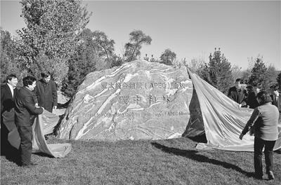 图为APEC会议碳中和林纪念石碑揭幕仪式。