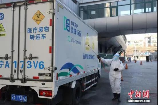 工作人员对医疗废物转运车辆进行消毒。中新社记者 李佩珊 摄
