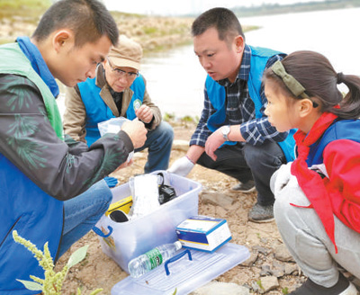 湖南湘潭市民间河长张一彬(左一)在湘江沿岸的唐兴桥排污口指导市民做简易水质检测。沈雪梅摄