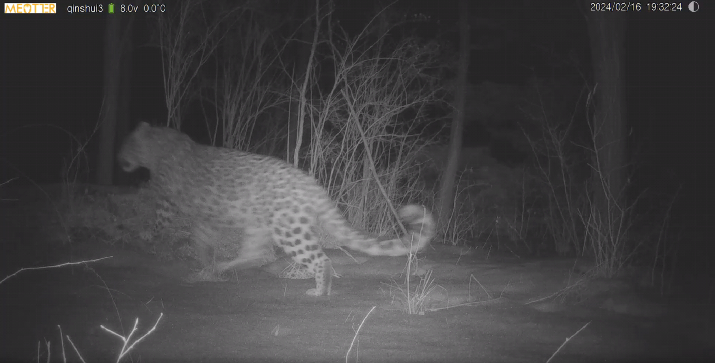 2024年2月16日,大年初七,科研人员收到一条实时回传的影像数据,在回传的影像当中清晰可见一只华北豹的活动影像。该影像是布设在沁水县后洞沟村附近的红外相机拍摄到的。这头成年华北豹体型健硕,体态优美,散发着顶级掠食者独具的霸气从容。