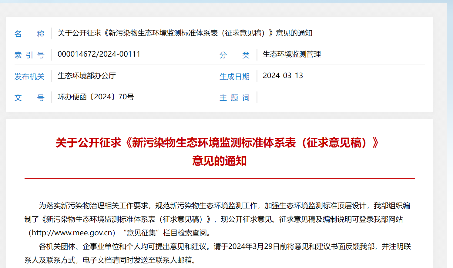为规范新污染物生态环境监测工作,加强生态环境监测标准顶层设计,生态环境部组织编制了《新污染物生态环境监测标准体系表(征求意见稿)》(以下简称《体系表》),于2024年3月13日公开征求意见。