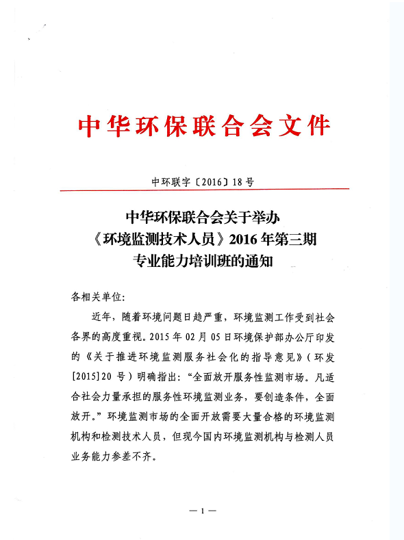 中华环保联合会关于举办《环境监测技术人员》2016年第三期专业能力培训班的通知