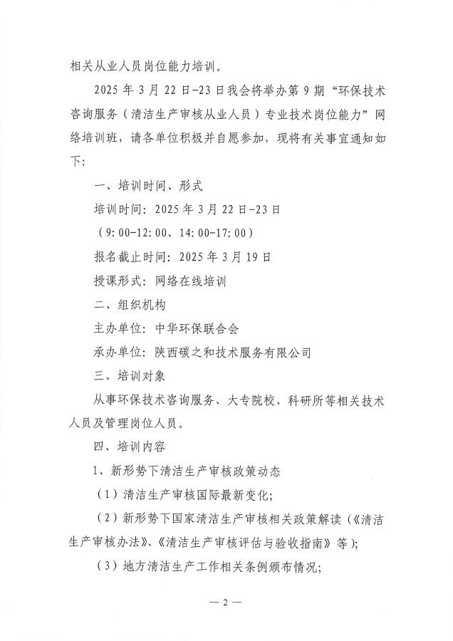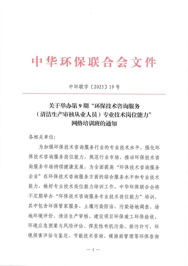 关于举办第9期“环保技术咨询服务(清洁生产审核从业人员)专业技术岗位能力”网络培训班的通知
