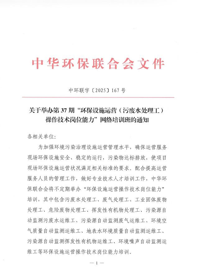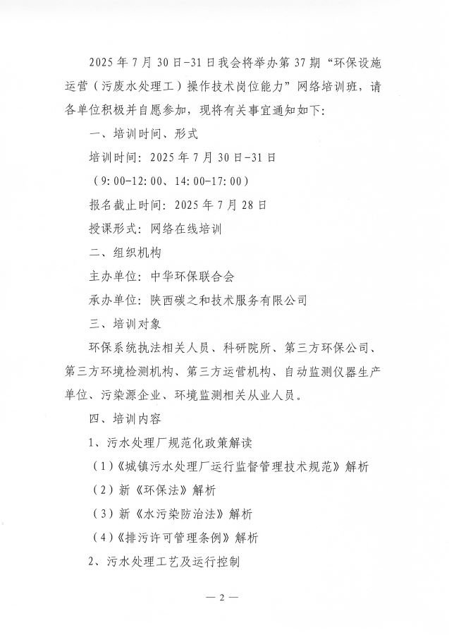 关于举办第37期“环保设施运营(污废水处理工)操作技术岗位能力”网络培训班的通知