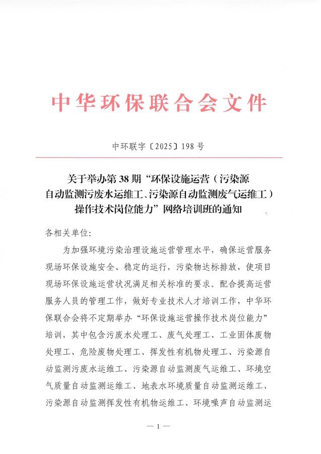 关于举办第38期“环保设施运营(污染源自动监测污废水运维工、污染源自动监测废气运维工)操作技术岗位能力”网络培训班的通知