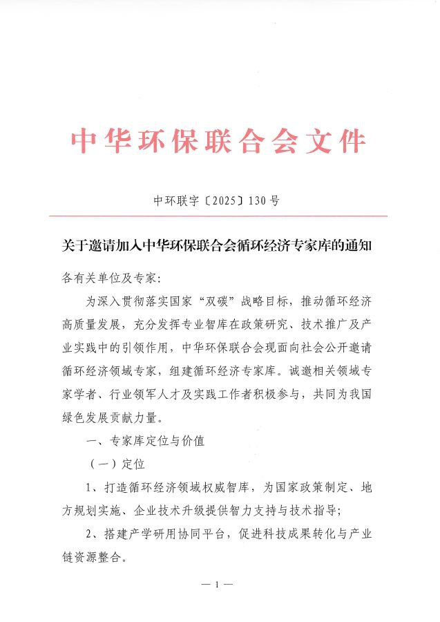 关于邀请加入中华环保联合会循环经济专家库的通知