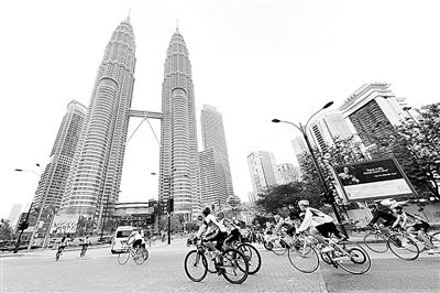 1月5日,在马来西亚首都吉隆坡,人们骑自行车经过双子塔。