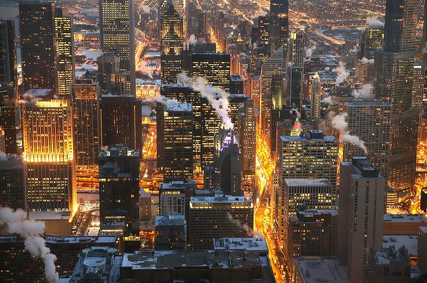 1月7日美国芝加哥的气温终于回升上零度,市内大楼的楼顶上冒出了阵阵蒸汽。