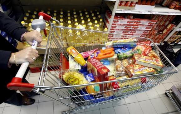 图片说明:法国南部城市尼斯的一座超市中,一名购物者正推着购物车选购食品。