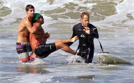 众人将受伤游泳者救上海岸。