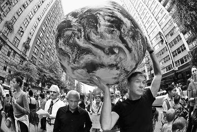 9月21日,在美国纽约,一名男子带着地球模型参加游行,呼吁关注气候变化问题。新华社/路透