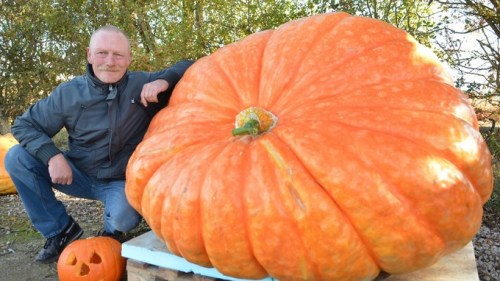 现年50岁的马尔·卡特来自英格兰北部的米德尔斯堡。他培植的大南瓜中1025磅(465公斤),重量相等于五头小象,需要动用起重机才能成功搬动南瓜。
