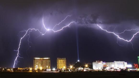 美国内华达州拉斯维加斯市上空划过一道闪电。(自路透社)