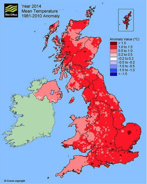 2014年,英国平均气温是9.9°C,比2006年创下的气温记录高出0.2度。气象办公室表示,这并不是由于某个月出现了极端气温,而是除了8月份以外的每个月的气温均普遍偏高。这一新纪录也意味着,英国10个最热年份中有8个出现在2002年以后。