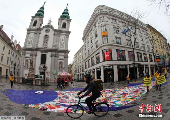 当地时间2015年1月29日,奥地利维也纳,环保人士用800只购物袋在大街上拼成鱼形,抗议塑料制品造成的海洋污染。
