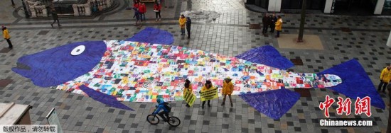 奥地利环保人士用购物袋拼巨形鱼 抗议海洋污染