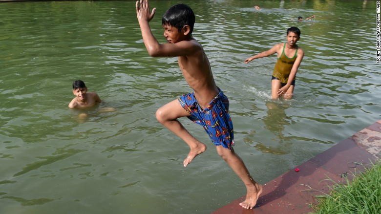 男孩跳入水中,想借此消暑降温。(Money Sharma/法新社/盖蒂图片社)